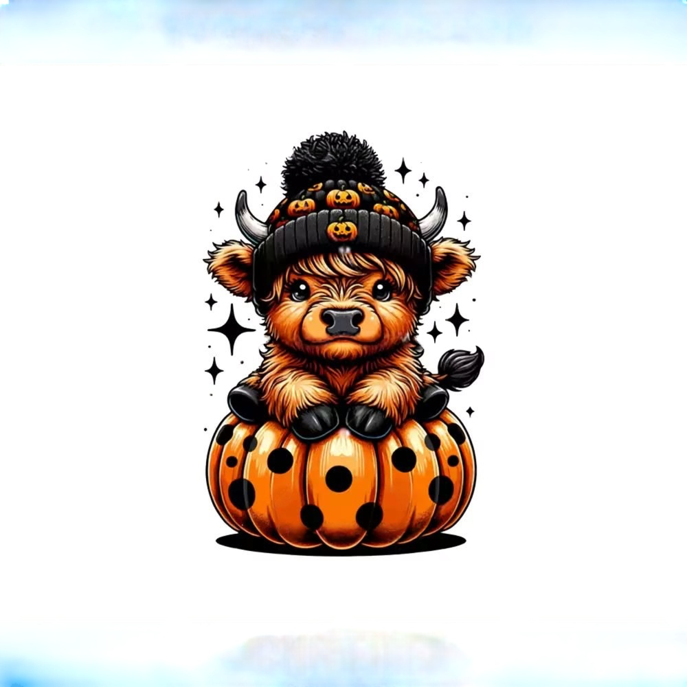 A fluffy Highland cow cozied up in a pumpkin beanie, perched on a polka-dot jack-o’-lantern. The perfect mix of rustic charm and Halloween spirit for fall lovers everywhere.
